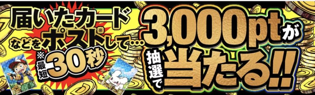 DOPAオリパは、Xで当選したカードの到着を報告するとポイントが当たるキャンペーンを実施しており、参加することで毎日数名に3,000ポイントが当選するチャンスがあります。
