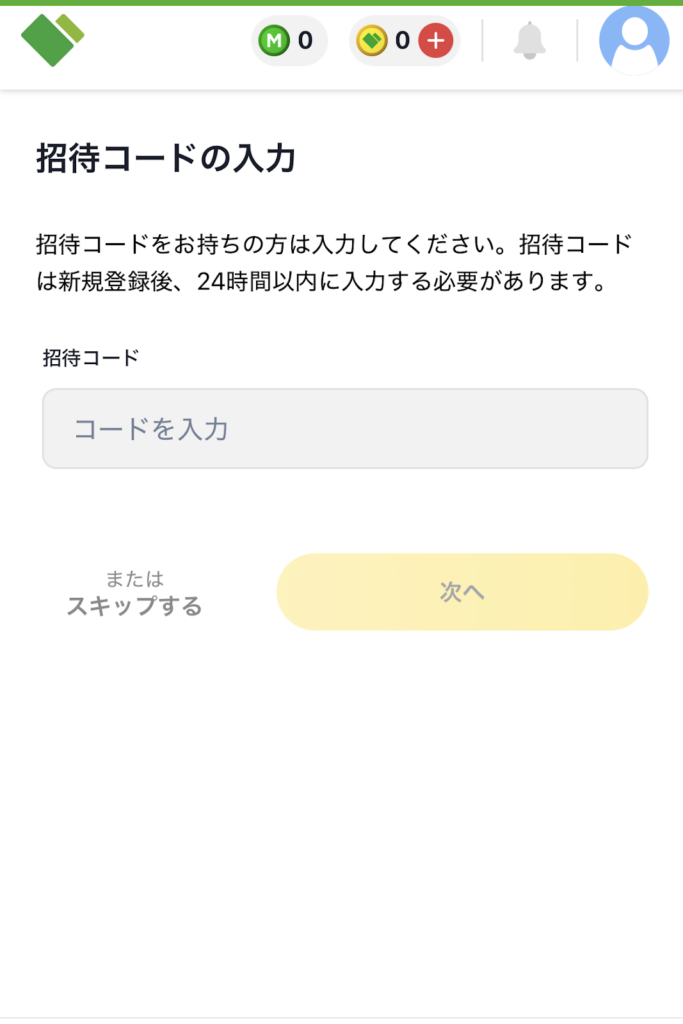 認証コードを入力すると、招待コードを入力する画面が出てきます。ここに、当サイト限定クーポンコードである「○○」を入力し、次へをタップしてください。