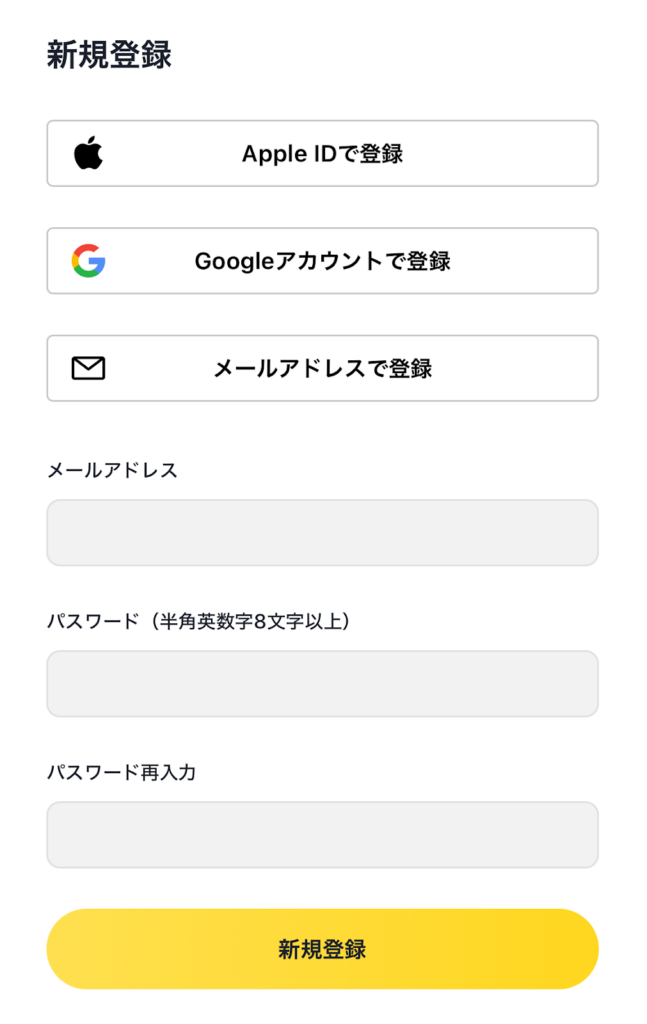 公式サイトの「新規登録」のボタンをタップし、「メールアドレスで登録」をタップしましょう。メールアドレスのほか、Apple IDやGoogleアカウントでの登録も可能です。