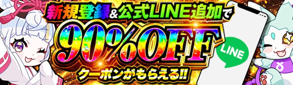 新規登録後に公式サイト上部のバナーからLINEを追加し、アカウント連携を完了させてクーポンを受け取れば、コイン購入時に最大90%OFFが適用されます。