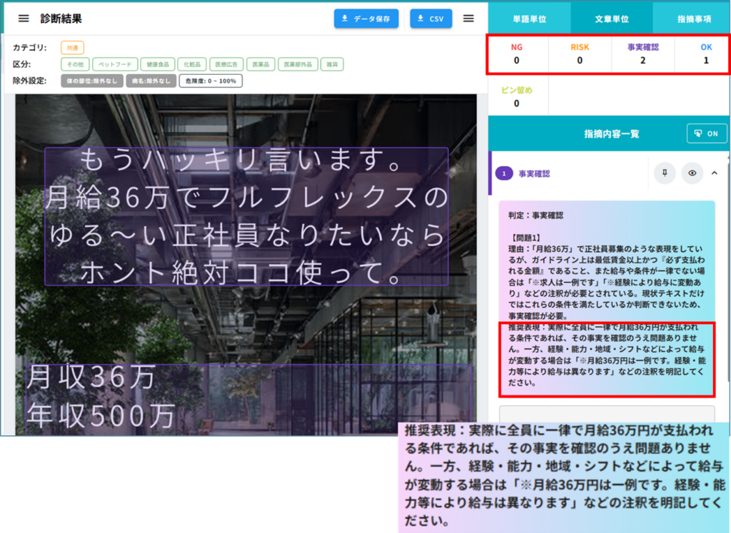 また、単にNG表現を指摘するだけでなく、推奨表現の提示にも対応しているため、修正の初動を早めやすい設計となっています。動画については自動でカットごとに確認し、ナレーションも含めてチェック可能です。さらに、企業独自のポリシーや媒体ごとの審査レギュレーション、現場で蓄積された修正ルールをAIに学習させることで、より運用実態に即したチェック体制の構築を支援します。