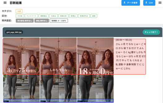 | チェック対象 | テキスト、画像、動画、LP(URL) |